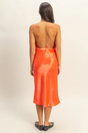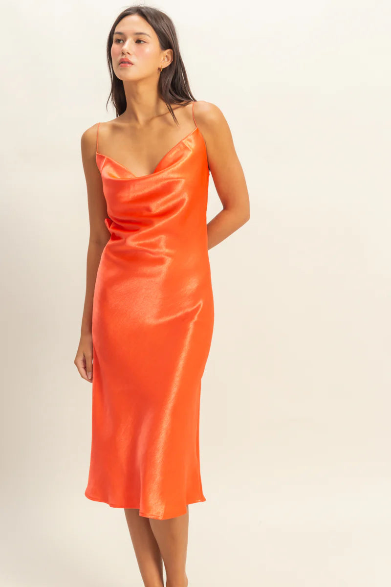 Satin Midi Dress Featuring A Draped Cowl Neckline Supported By Elastic Shoulder Straps. Designed With A Fitted Bodice And Open Back, Flowing Into A Figure-Skimming Midi-Length Skirt. Constructed From Lightweight Fabric, Suitable For Formal Or Evening Occasions.