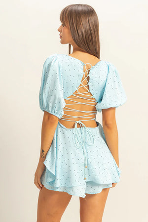 Mini Dress Featuring A Boat Neckline And Elbow-Length Puff Sleeves. Designed With A Fitted Bodice That Flows Into A Layered Ruffled Skirt. The Back Includes A Functional Lace-Up Detail For Adjustable Fit. Constructed From Polka-Dot Fabric For Added Texture And Visual Interest.