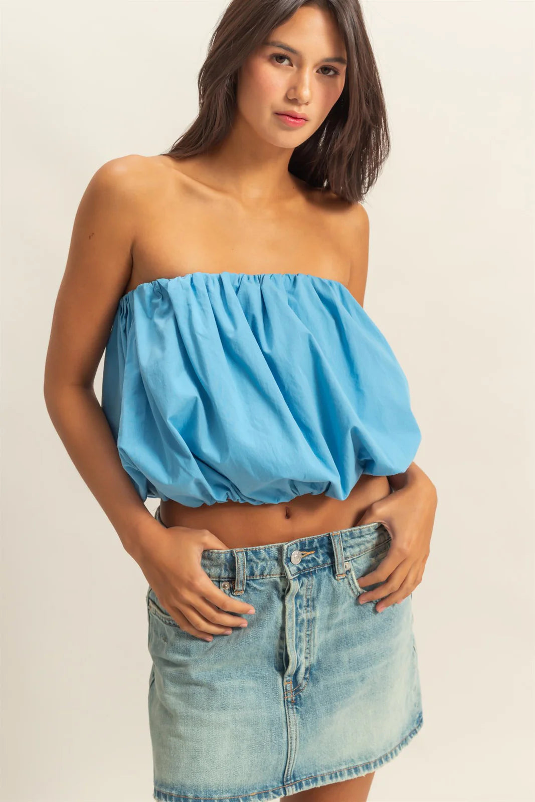 Stay Ahead Of The Trendy With This Super Cute Top! Featuring A Bubble Like Silhouette, This Top Has A Strapless Neckline And A Cropped Bodice. The Elasticized Detailing Along The Top And Bottom Of The Top Curves Inwards, Giving It A Bubble Like Shape
